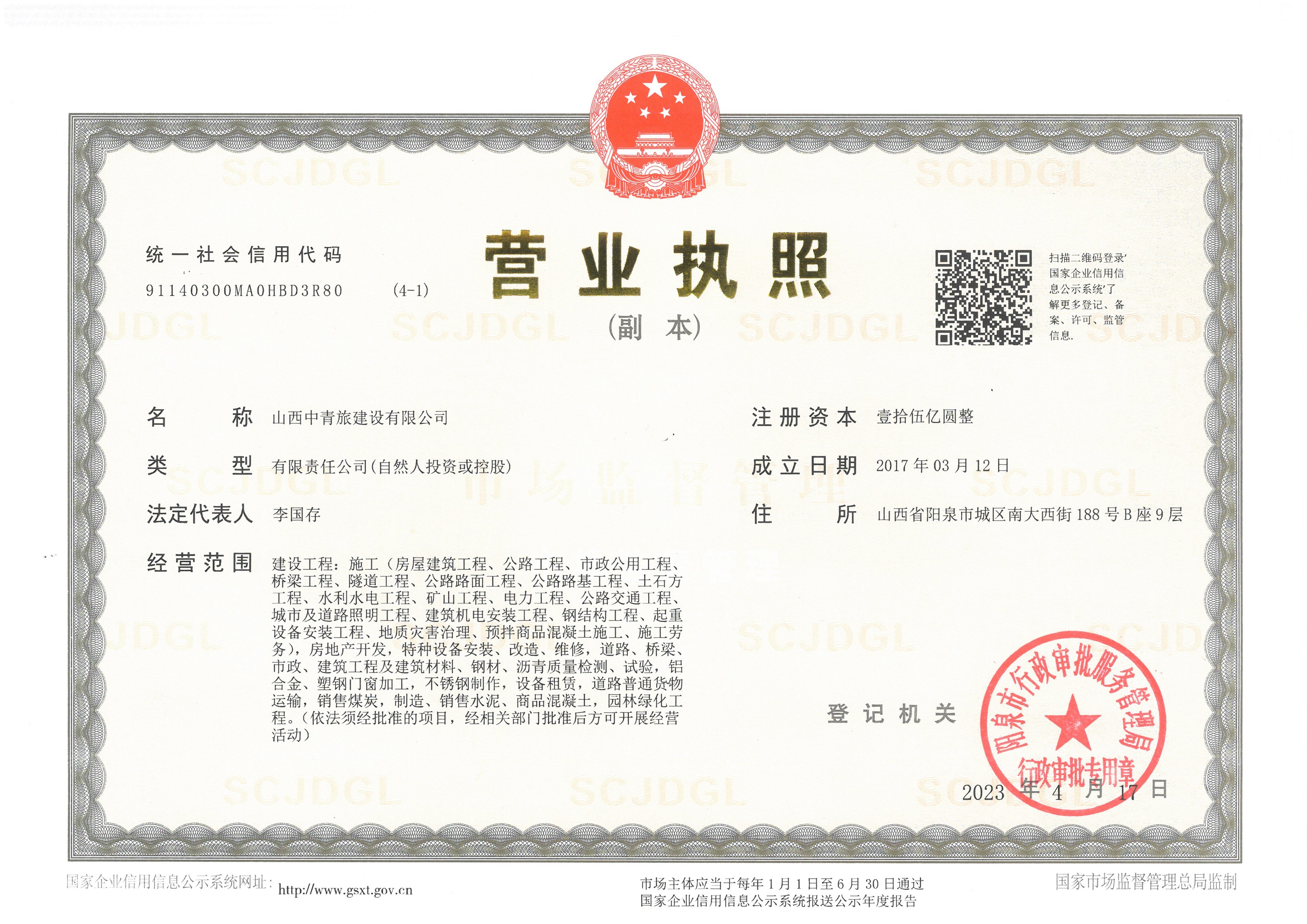 公司注冊資本15億元,年施工生產能力超百億元,具有國家建筑工程施工總承包壹級、公路工程施工總承包壹級、市政公用工程施工總承包壹級、橋梁工程專業承包壹級、隧道工程專業承包壹級……